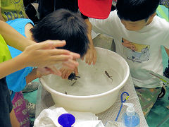 一番人気は、天水池に棲む生き物に触れる「水生生物ふれあい」のコーナーです。子どもたちがニホンイシガメ、アカハライモリ、ヤゴと遊びながら、最初から最後までにぎやかでした。 |