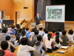 | 体育館で行われた5・6年生合同によるメダカ交流会では、久保田先生が開催の主旨と増岡組を紹介して下さり、増岡組環境技術研究所所長の渡邉より、増岡組の仕事の内容、環境についての取組などを説明しました。 |