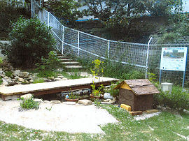 生き物好きの園児たち皆さんが待ちに待ったビオトープの完成です。 |