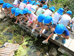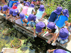 | 今回のメダカ大使は、 広島市東区にある比治山大学短期大学部付属幼稚園の‹ビオトープ観察会›へ行ってきました。 |