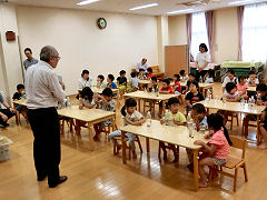おたまじゃくしには足が出ているもの、手足が出ているものもいて、園児たちは、カエルの体が少しずつ変わっていくことに興味を持った様子でした。 |