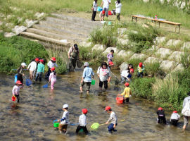 第11回メダカセミナーは、呉市立呉中央小学校1年生の「げんきにそだて」〜わくわく二河川いきものたんけん〜に参加し、学校前に流れる二河川を探索しました。