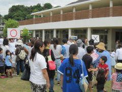 | 父兄たちが芝生の養生の根切りをしている間に、父兄参加の「生き物○×クイズ」が行われました。園の先生たちが準備された問題は難問が続出で、参加者たちは○へ×へと行ったり来たりの大奮闘でした。 |