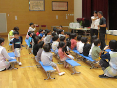 | 観察会は、年中組43名、年長組50名の2回に分けて行いました。エコラボからバッタ、キリギリス、コオロギを連れていき、それぞれの特徴の話や、見分けクイズをしました。 |
