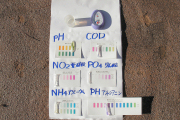 6/27例年よりかなり早い梅雨明け。浮草が一面を覆い、蒸散による水位低下は抑えられるが、解放水面が無く、毎週部分撤去。 |